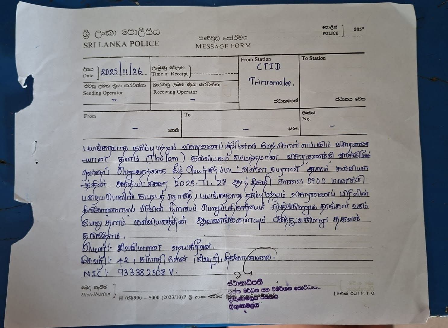 ත්රිකුණාමලයේ තරුණ තරුණියන්ගේ අධ්යාපනය, රැකියා සහ කුසලතා සංවර්ධනය යන ක්ෂේත්රවල පසුගිය වසර හතක් තිස්සේ කටයුතු කරන “තලම්” හි ප්රමුඛ ක්රියාකාරීන් සහ අධ්යක්ෂවරුන්ගෙන් කෙනෙකු වන ආචාර්ය සී. හයාකිරිවන් (කාර්ති හයාන්) 2025.11.28 වන දින ත්රිකුණාමලයේ ත්රස්තවාදය වැළැක්වීමේ සහ විමර්ශන ඒකකය හමුවේ පෙනී සිටින ලෙස CTID විසින් කැඳවා තිබේ.