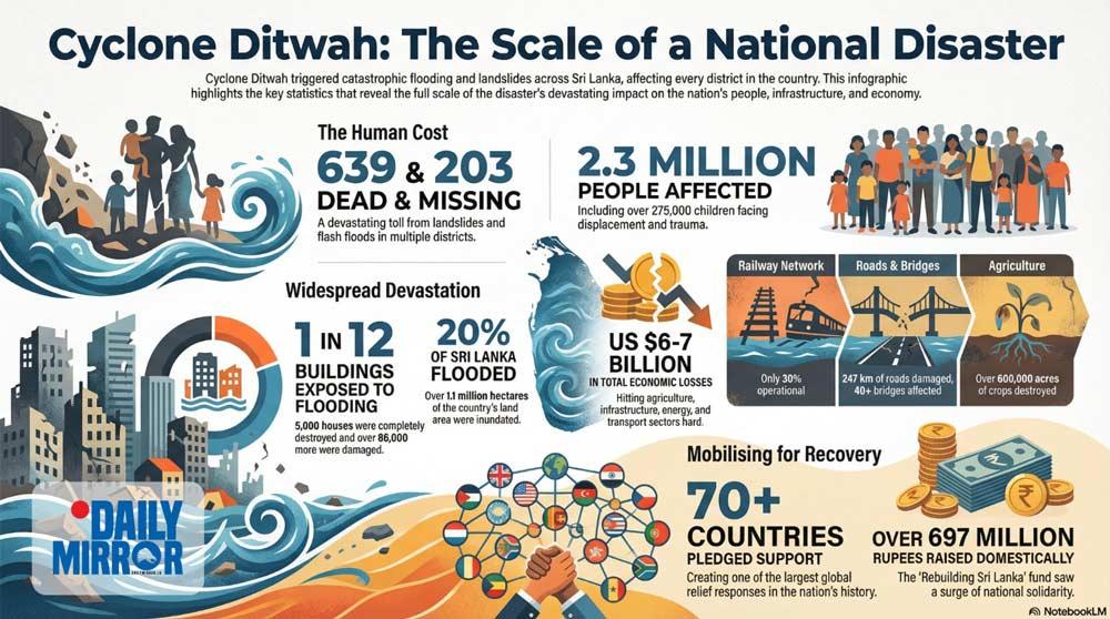 ආපදාව වැඩිපුර බලපාන්නේ කෘෂිකාර්මික හා සංචාරක කර්මාන්ත වලටයි. එහෙත් මේ අංශ දෙකටම මාස හයක් ඇතුළත නැවත හිස එසැවිය හැකියි. ඒ අතරවාරයේ ආර්ථික වර්ධන වේගයේ අඩුවක් විය හැකියි. ඉදි කිරීම් කටයුතු ඉහළ යාම නිසා එම අඩුවෙන් කොටසක් නිශේධනය විය හැකියි. රටේ ආර්ථිකය නැවතත් දිගුකාලීන වර්ධන පථයට ලඟා වුවත්, එය සිදු වන අතරවාරයේ පහත යන නිෂ්පාදනය නිසා මම වසරේ අවසන් කාර්තුවේ සහ ඉදිරි වසරේ මුල් කාර්තු දෙකේ වර්ධන වේගයන් සීමා වීම පැහැදිලිව පෙනෙන්න තිබෙන දෙයක්. එහෙත් ඉදිරි වසරේ දෙවන භාගය තුළ නැවත ආර්ථිකය යථා තත්ත්වයට පත් වෙයි. ඒ නිසා, 2027හා ඉන් පසුව රටේ වර්ධන විභවයට මෙම සුළි කුණාටුවේ බලපෑම ඉතිරි වන්නේ නැහැ.