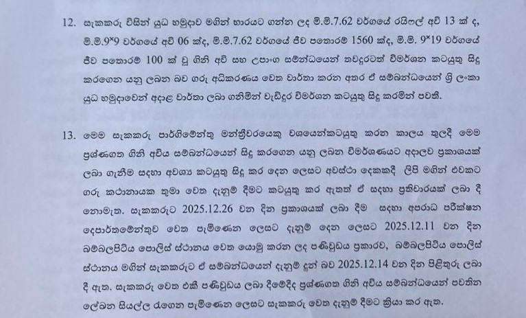 ඒ අනුව මේ සම්බන්ධයෙන් සිදු කළ නීතිමය හා විමර්ශන කටයුතු පිළිබඳ සම්පූර්ණ වාර්තාව අධිකරණයට ඉදිරිපත් කර ඇති බව මෙයින් දන්වමි.”