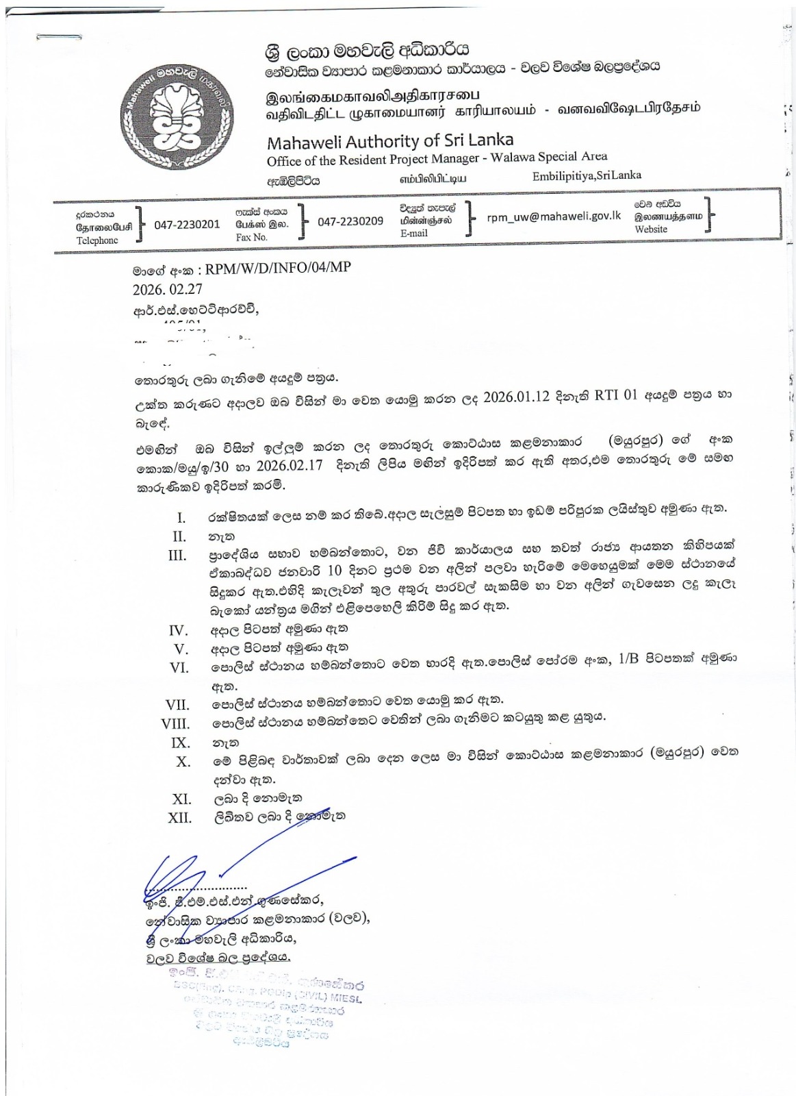 තොරතුරු දැනගැනීමේ අයිතිවාසිකම යටතේ මහවැලි අධිකාරියෙන් ලබාගත් ලේඛන