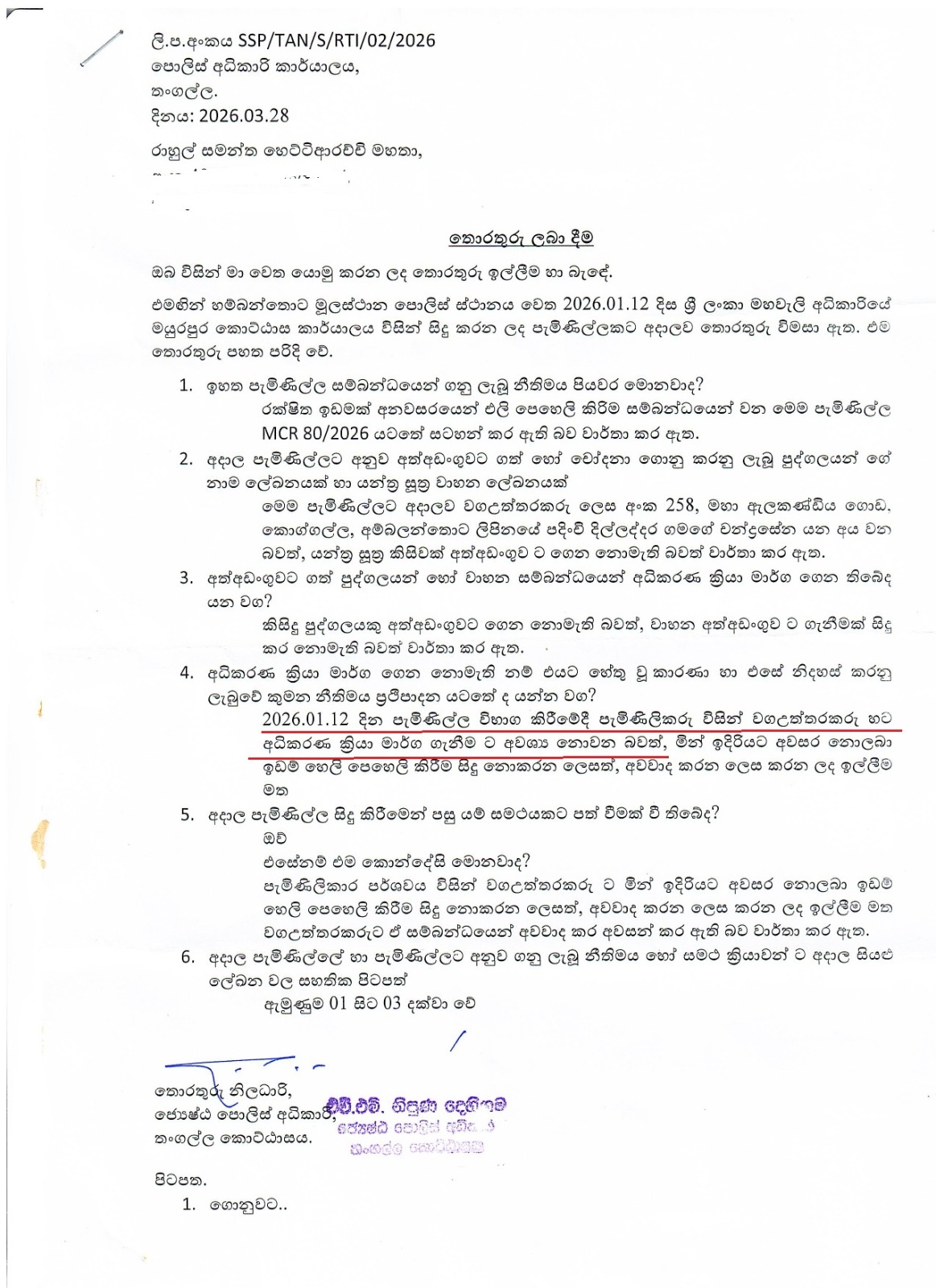 තොරතුරු දැනගැනීමේ අයිතිවාසිකම යටතේ ශ්රී ලංකා තංගල්ල ජ්යෙෂ්ට පොලිස් අධිකාරී කාර්යාලයෙන් ලබාගත් තොරතුරු